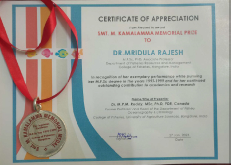 Dr Mridula Rajesh has been awarded with “Smt. M. Kamalamma Memorial Prize” on 27 Jan, 2023 in recognition of exemplary performance while pursuing MFSc degree in the years 1997-99 and continued outstanding contribution to academics and research. The award consists of a certificate, silver medal and a cash prize of Rs 10,000/-.