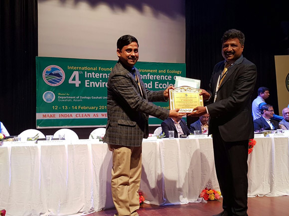 Dr Shivakumar Magada, Professor of Aquatic Biology and Head of Krishi Vigyan Kendra, Dakshina Kannada is conferred with “Environmentalist of the Year 2017” at 4th International Conference on Environment and Ecology on 12.02.18 at Gauhati University, Guwahati, Assam.