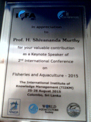 Prof (Dr) H Shivananda Murthy, Professor & Head, Dept of Aquaculture, participated in the ‘International Conference on Fisheries & Aquaculture’ held at Colombo, Sri Lanka, as Keynote speaker during 25-27 August, 2015.