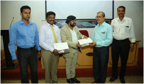 There were four success stories presented by the progressive farmers. Mr Kumar V Naidu, a successful agripreneur from Shimoga explained about integrated fish farming. Mr NareshHanbal shared his experience in integrated Farming Systems (IFS) in Malnad area. Both of them showed video clips and power point explaining successful implementation of many innovative ideas. Mr Sunny D’ Souja from Mangalore gave a talk Bio Floc Technology (BFT). He is doing shrimp farming in one acre in Haleyangadi, 20 km away from Mangalore. Using BFT he has harvested 17 t/acre of shrimp in 4 months, saving cost on energy and feeds. Mr Renold D’Souja, an alumnus of College of Fisheries, Mangalore and successful ornapreneur explained scopes in ornamental fish production and marketing. Dr ShivakumarMagada gave a talk on success stories of IFS from Mandya, Shimoga and Chikkamagalur districts of Karnataka. Mr Krishnaprasad shared his experience in fish culture in Urban Lakes i.e. Sanky Tank of Bangalore. Later Dr Jayaraj summarized all the presentations. There was a open house interaction at the end. Dr VijaykumarYargal, Deputy Director, Marine Product Export Development Authority (MPEDA), Karnataka and Goa region, Dr AsokKumar, Deputy Director, MPEDA, Dr VarunBagalodi, Consultant, Ornamental Fish Division, MPEDA, Mrs.Divya, Asst. Director of Fisheries (ADF), Mrs.SushmithaRao, ADF, Dr K S Ramesh, Mr Narayan, NETFISH were present in the program. The program was conducted in collaboration with Unibait Feeds, Rudra Techno Feeds, cFog.inc, Hyderabad, NETFISH, MPEDA, Asian Fisheries Society Indian Branch (AFSIB), College of Fisheries Alumni Association (COFAA) and Professional Fisheries Graduate Forum (PFGF), Mumbai.