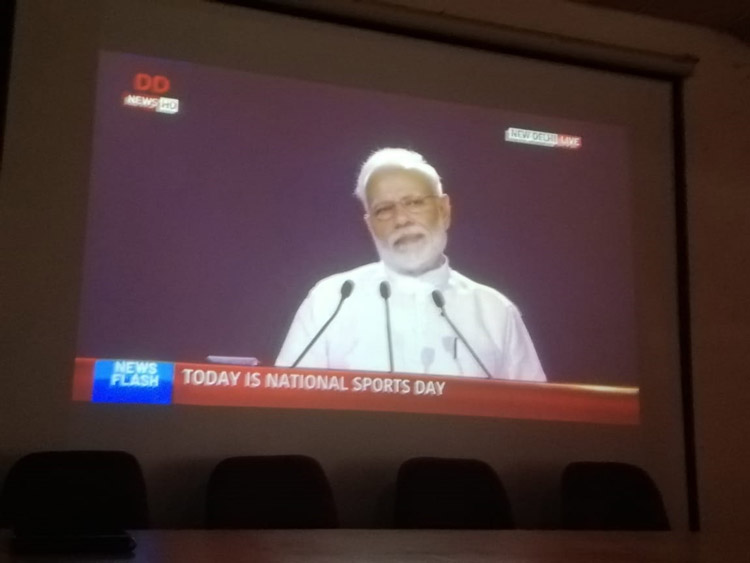 The live telecast of launching programme was arranged for viewing on Doordarshan at Prof. H.P.C. Shetty Seminar Hall of the college for the benefit of Students, Teaching, Non teaching and Project staff. After the launch, the staff and students took the Fitness Pledge which was administered by the Hon'ble Prime Minister of India.