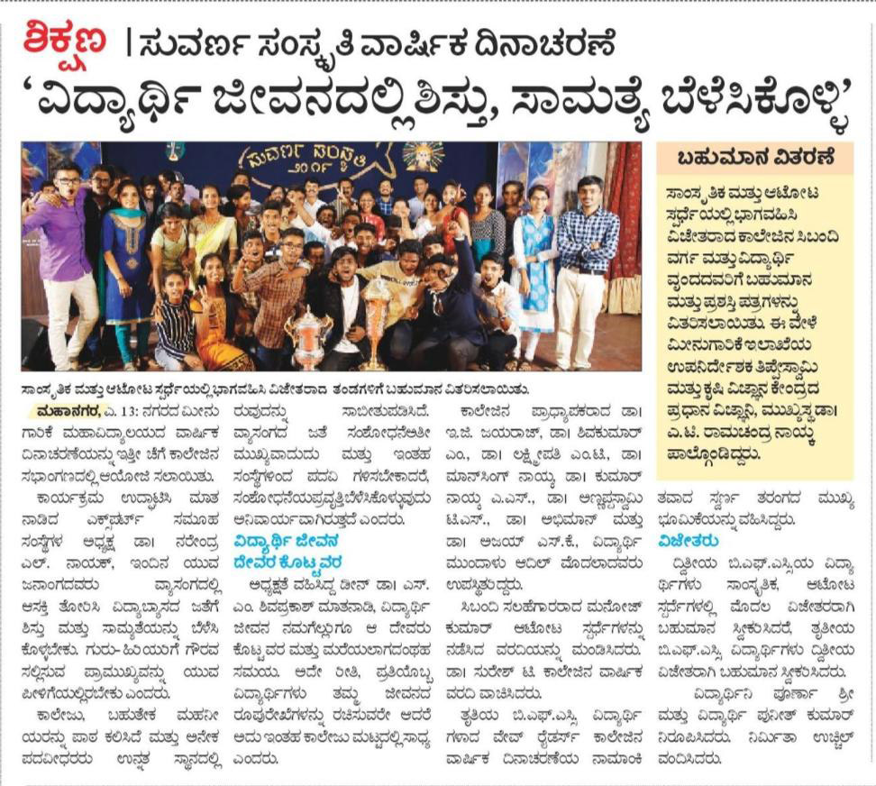Ethnic and Cultural Day was celebrated in the College as a part of Golden Jubilee College Day on 10th April 2019 at 10:00 am onwards. Several variety competitions like Debate - Kannada, Debate – English, Quiz, Solo singing, Duet song, Mono acting, Group singing, Mime show, Stand up comedy, Solo dance, Mad ads, Group dance, Fashion show, Skit, Dumb charades were conducted, which was organized by WaveRiders (Students of III B.F.Sc) during this day.