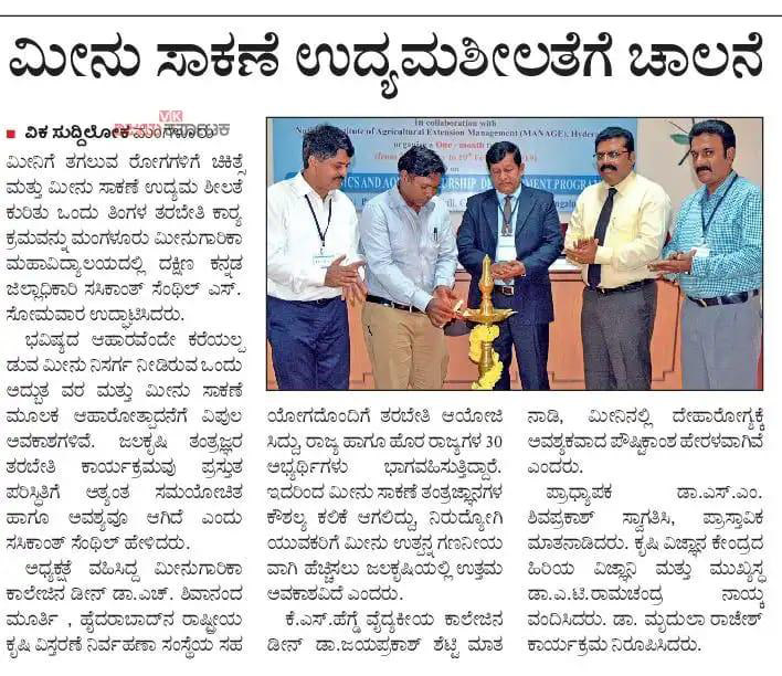 Dr. R. Vijayan, Manager incubation center MANAGE Hyderabad was the guest of honor. The programme was presided by Prof. (Dr.) H. Shivananda Murthy, Dean (Fisheries).