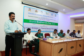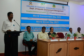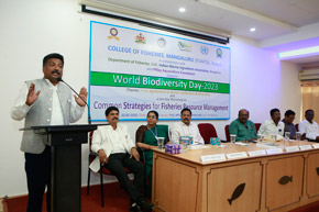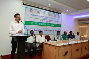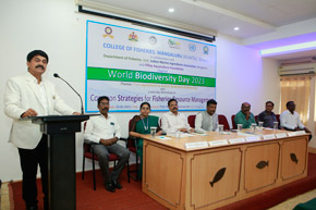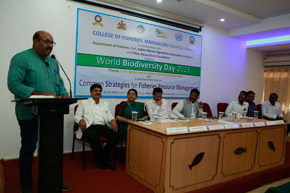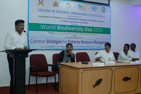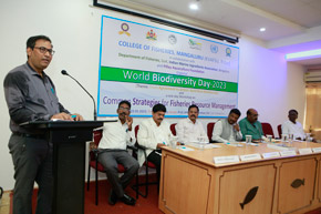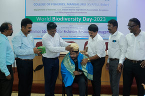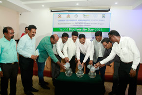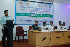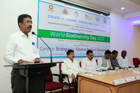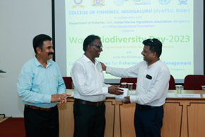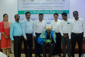 The College of Fisheries in collaboration with Dept. of Fisheries, Govt. of Karnataka; Indian Marine Ingredients Association, Bengaluru and Pillay Aquaculture Foundation organized ‘World Biodiversity Day – 2023’ on 22nd May, 2023 on the theme: ‘From Agreement to Action : Build Back Biodiversity’ at Prof. H.P.C. Shetty seminar hall. The programme was inaugurated by Mr. Harish Kumar, Joint Director, Dept. of Fisheries, Mangaluru. Mr. Rajkumar Naik, Deputy Director, regional centre of MPEDA, Mangaluru; Dr. S.M. Shivaprakash, former Dean of the college & Executive Member of Pillay Aquaculture Foundation; Dr. Sujitha Thomas, Principal Scientist, regional centre of CMFRI, Mangaluru and Mr. Chethan Bngre, President, Trawl Boat Association, Mangaluru were the guests of honour during the occasion. Dr. Shivakumar M., Dean of the college presided over the function.