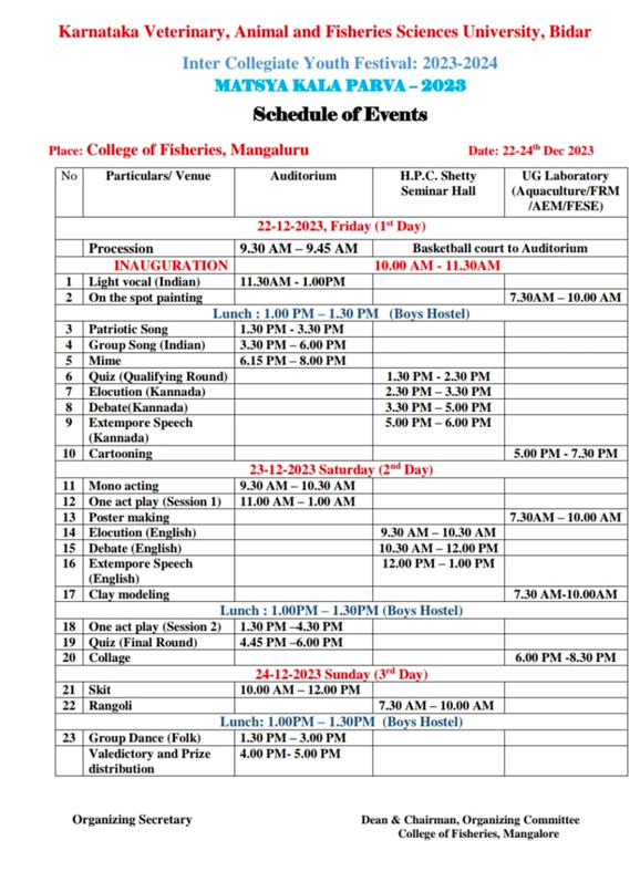 KVAFSU - College of Fisheries, Mangaluru, hosted the 17th Intercollegiate Youth Festival, "Matsya Kalaparva 2023" in the College Auditorium from December 22nd to 24th, 2023. 8 constituent colleges of the prestigious Karnataka Veterinary, Animal and Fisheries Sciences University (KVAFSU) participated in the event.